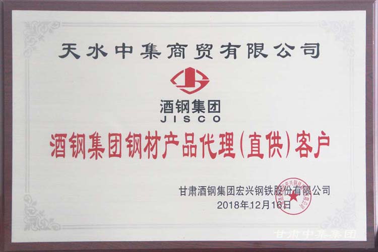 2018年12月12日,甘肅中集實業(yè)集團有限公司及下屬子公司蘭州中集商貿(mào)有限公司、天水中集商貿(mào)有限公司榮獲“酒鋼集團鋼鐵產(chǎn)品代理(直供)客戶”及“2018年度金牌代理商”殊榮。